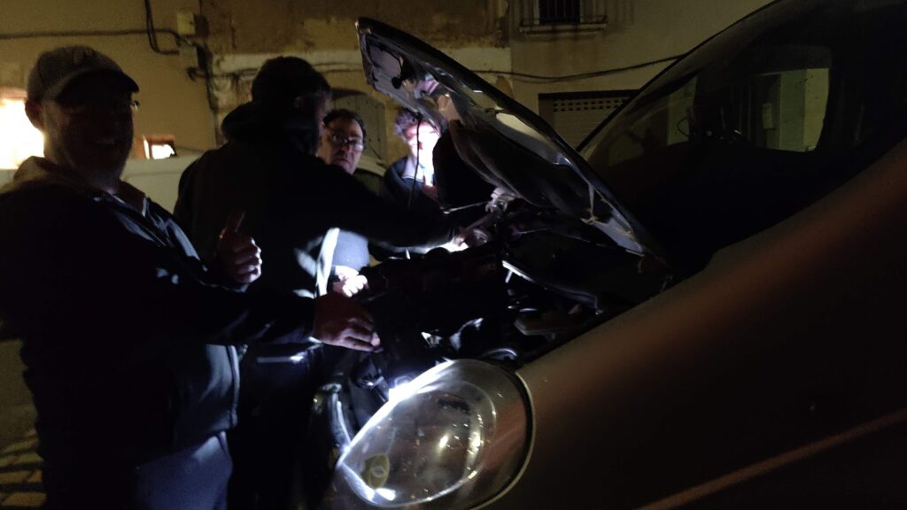 Jordi offered to have a look as he works on their van all the time and definitely knows more about these things than I do. We went out and got to work with torches and spare bulbs galore and… the bulb wouldn’t come out. Then the neighbours got back for the night and being mechanically inclined got involved.